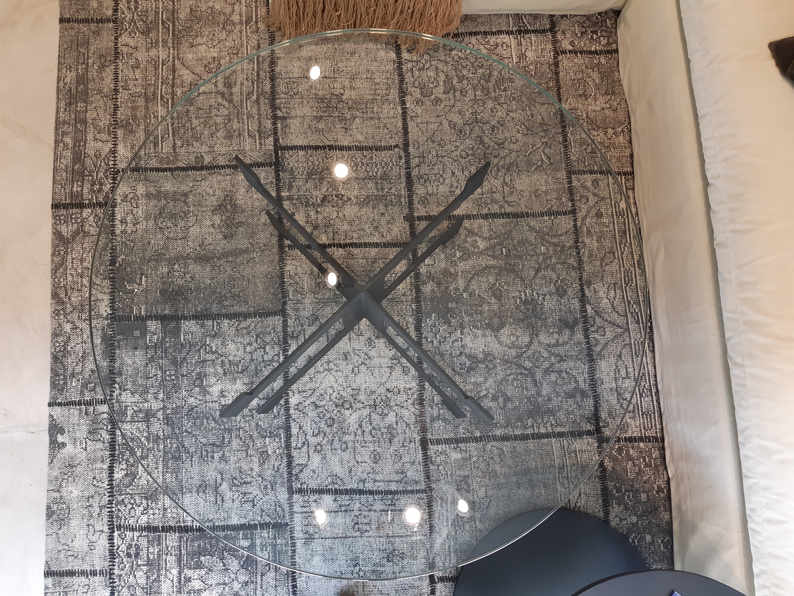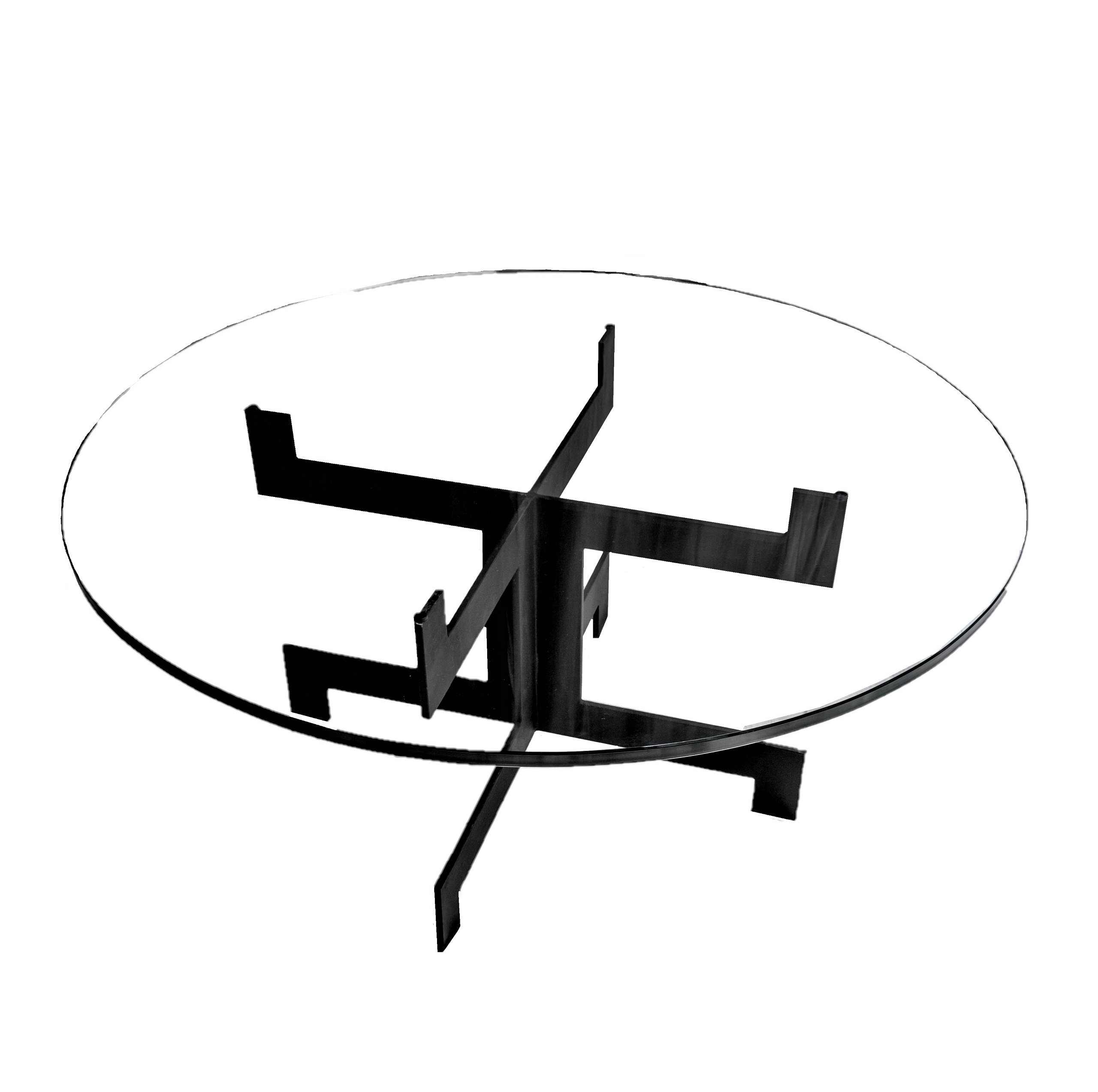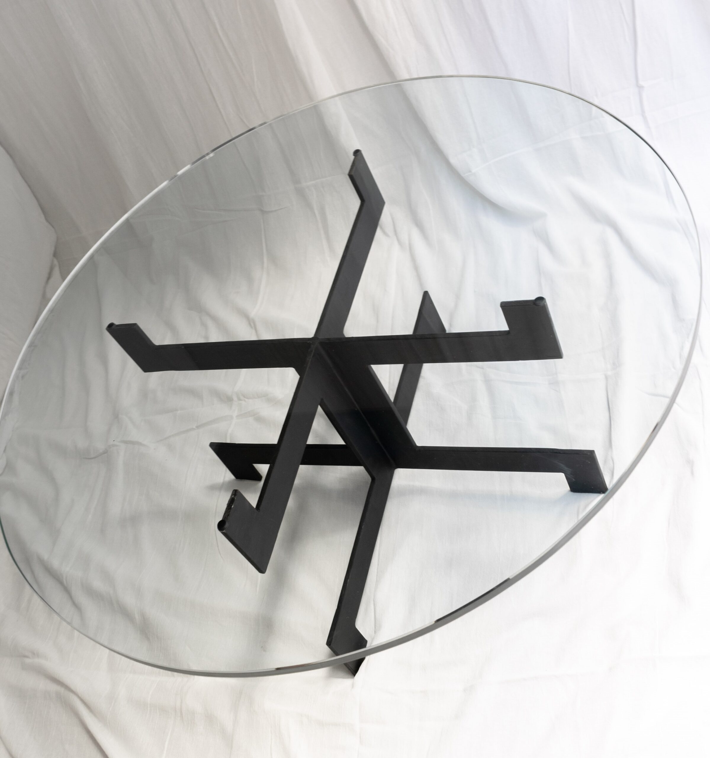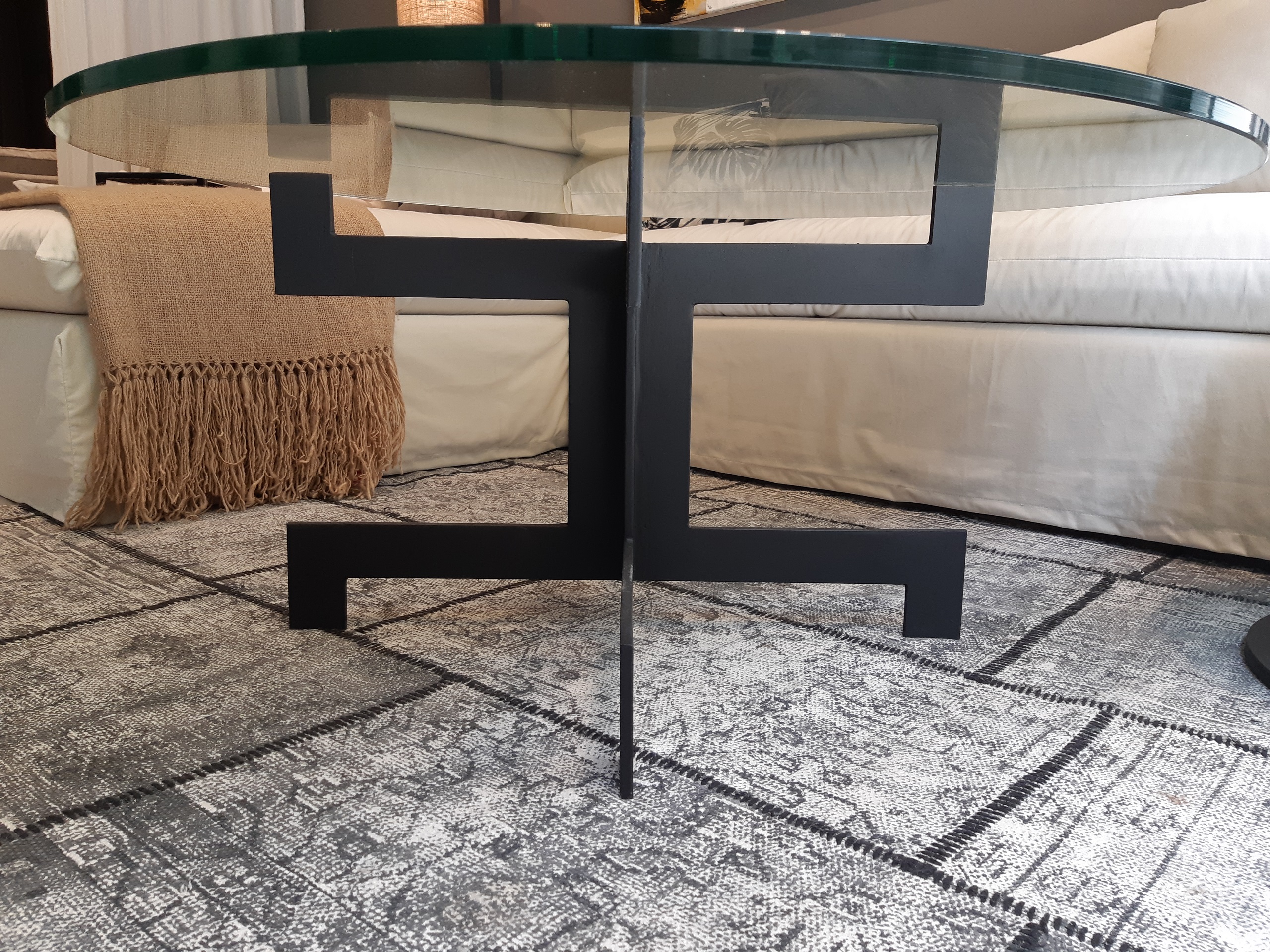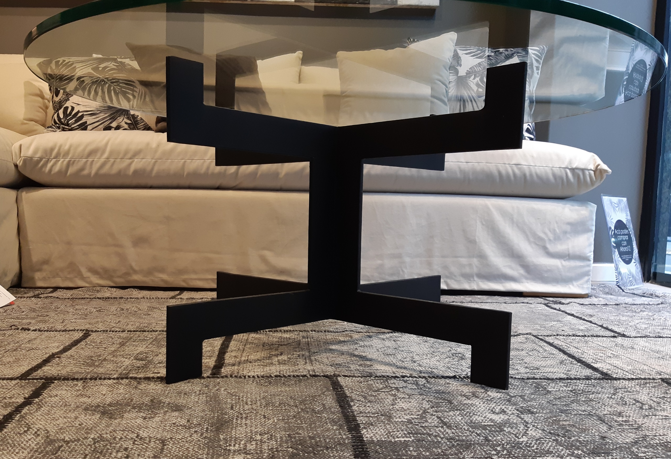 Mesa centro con tapa redonda de cristal de 15 mm, su base hierro es de hierro macizo pintado a soplete.